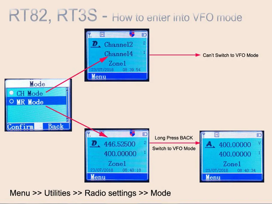 - Click “Menu” and select: Utilities > Radio Settings > Mode > CH Mode.